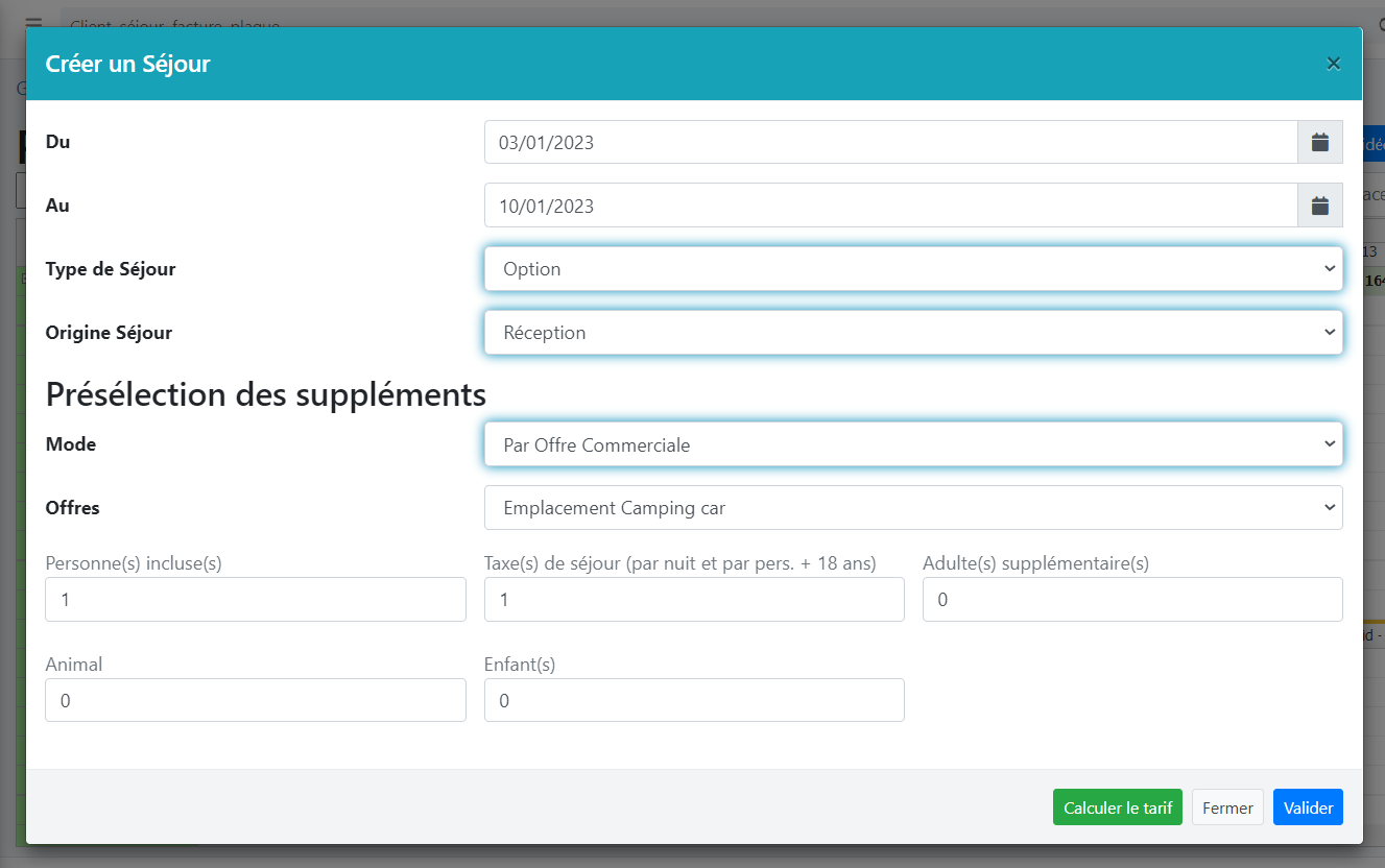 Exemple ci-dessous, où vous pouvez spécifier le nombre de suppléments avant même la création du séjour