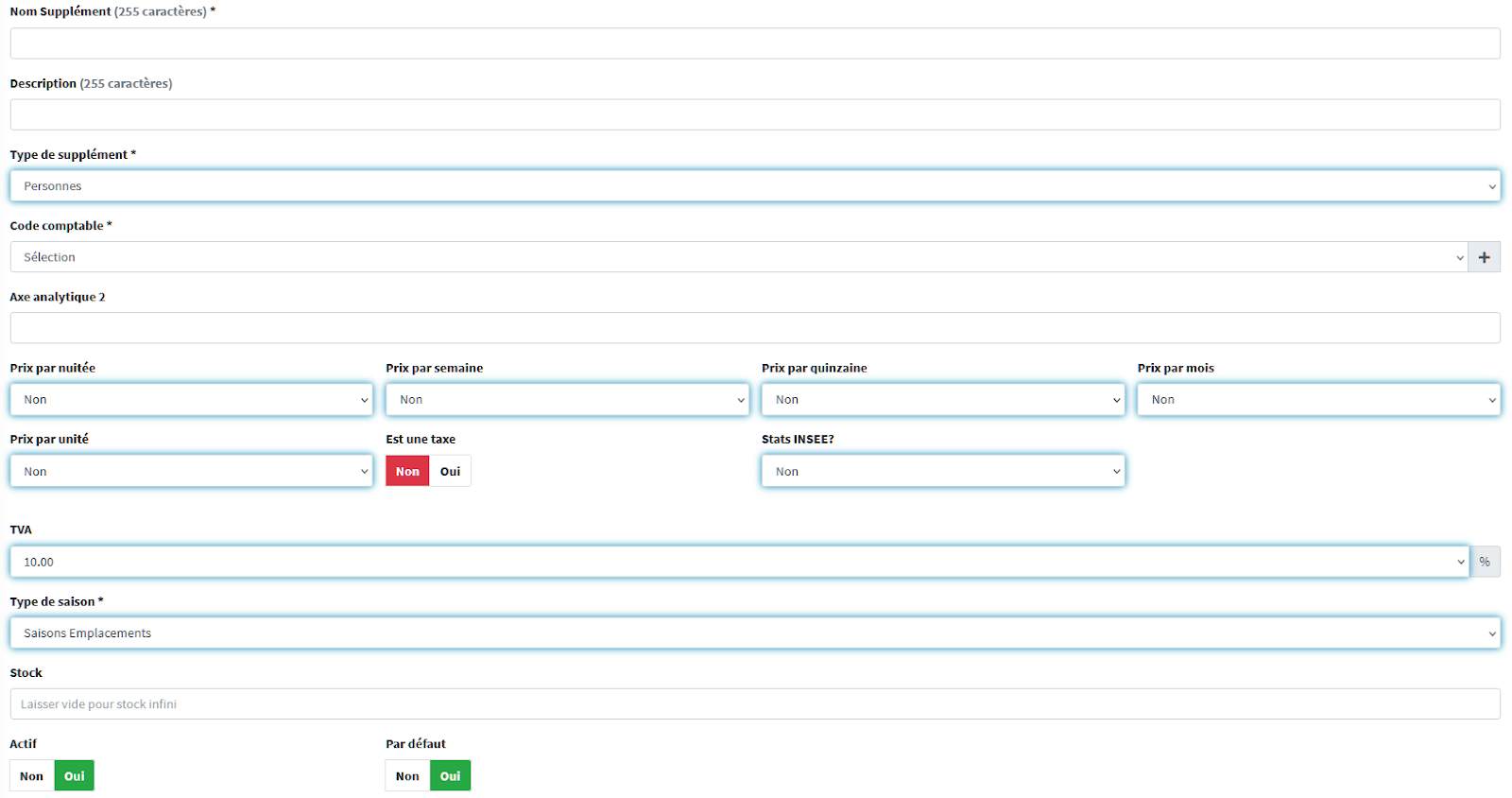 Par défaut : Indique si le supplément est affiché par défaut dans les fenêtres de création de séjour (écran planning, recherche d’emplacement libre)