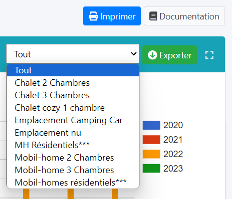 Cet écran vous permet d’obtenir des informations relatives au taux d’occupation mensuel ou hebdomadaire. Les données affichées par le logiciel sont comparatives jusqu’à 5 ans en arrière.