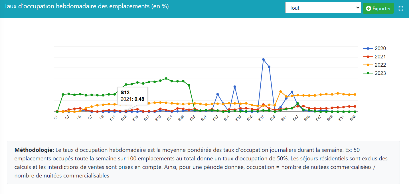Méthodologie: Le taux d'occupation hebdomadaire est la moyenne pondérée des taux d'occupation journaliers durant la semaine. Ex: 50 emplacements occupés toute la semaine sur 100 emplacements au total donne un taux d'occupation de 50%. Les séjours résidentiels sont exclus des calculs et les interdictions de ventes sont prises en compte. Ainsi, pour une période donnée, occupation = nombre de nuitées commercialisées / nombre de nuitées commercialisables