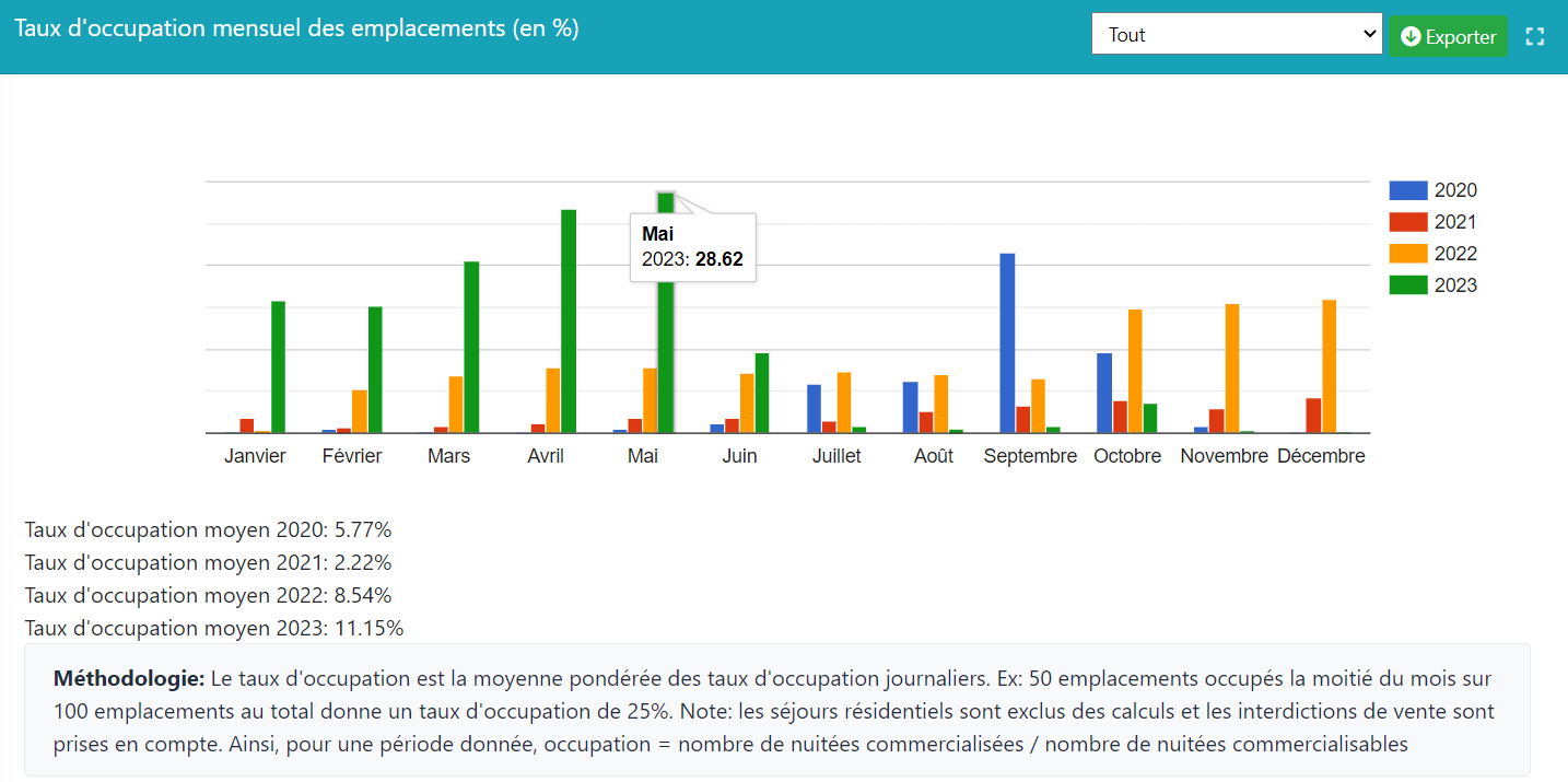 Méthodologie: Le taux d'occupation est la moyenne pondérée des taux d'occupation journaliers. Ex: 50 emplacements occupés la moitié du mois sur 100 emplacements au total donne un taux d'occupation de 25%. Note: les séjours résidentiels sont exclus des calculs et les interdictions de vente sont prises en compte. Ainsi, pour une période donnée, occupation = nombre de nuitées commercialisées / nombre de nuitées commercialisables