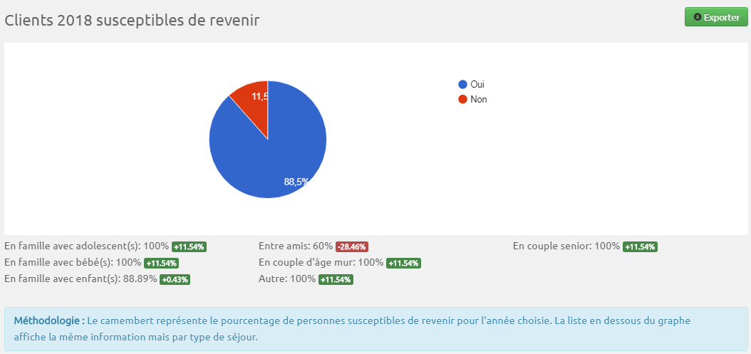 HippoCamp vous affiche les clients 2018 susceptibles de revenir sous forme de camembert interactif. En effet, en plaçant votre curseur sur les graphiques, des informations complémentaires sont affichées.