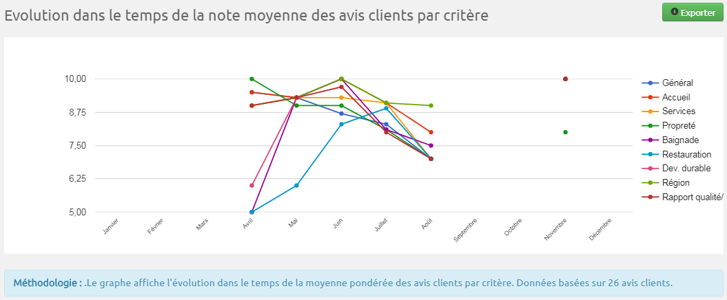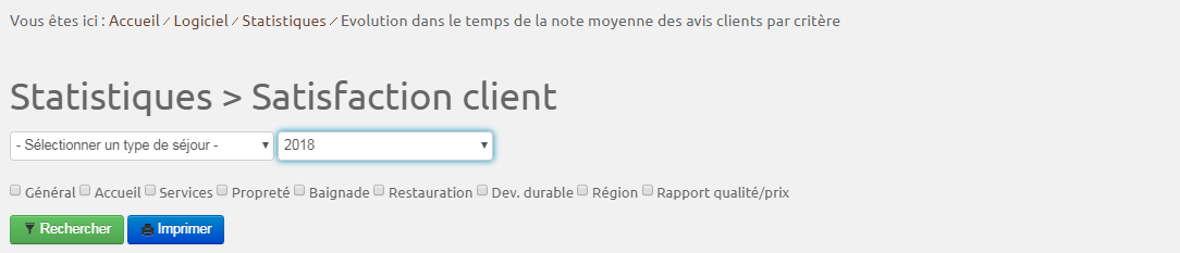 Une rangée de cases à cocher vous permet d’afficher / cacher les graphes concernant certaines prestations du camping. Ex : note générale, qualité de l’accueil, étendue des services offerts, propreté, qualité des installations de baignade, qualité de la restauration, développement durable, intérêt de la rédion, rapport qualité prix.
