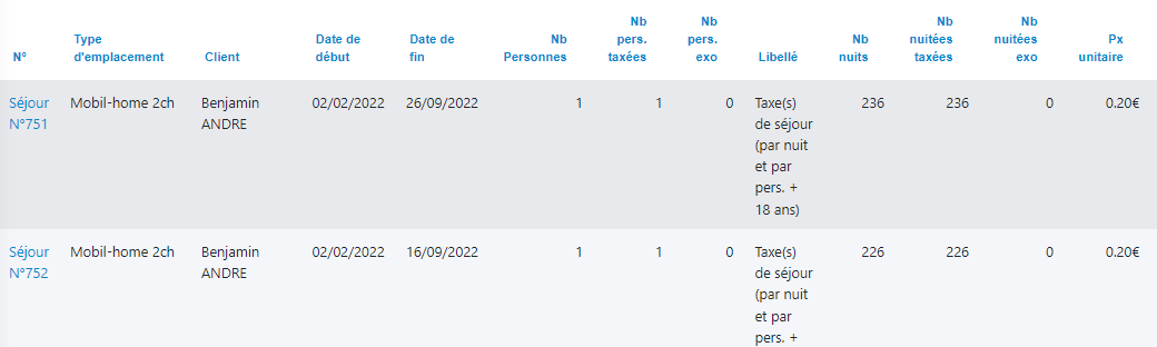 Nombre de personnes taxées : 2 taxes de séjour = 2