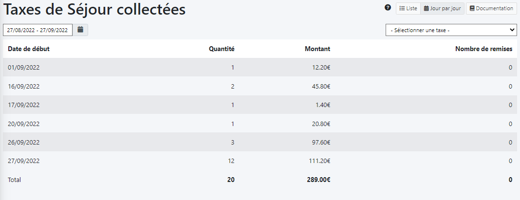 Dans ce mode de consultation des données, le logiciel vous affiche les totaux de la taxe collectée au jour le jour.