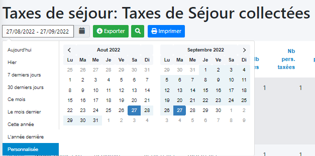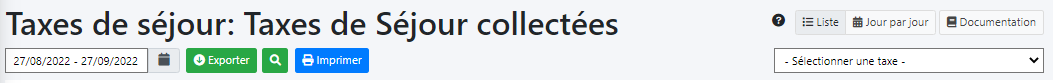 Important à comprendre: pour qu'une taxe soit affichée dans l'écran, il suffit qu'elle soit enregistrée dans un séjour (non annulé) dont la date de fin est comprise dans l'intervalle de recherche.