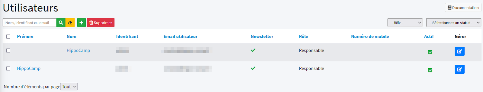 Dans HippoCamp, un utilisateur est défini par son nom, son identifiant, son email, son rôle, son numéro de mobile et son statut actif/inactif.