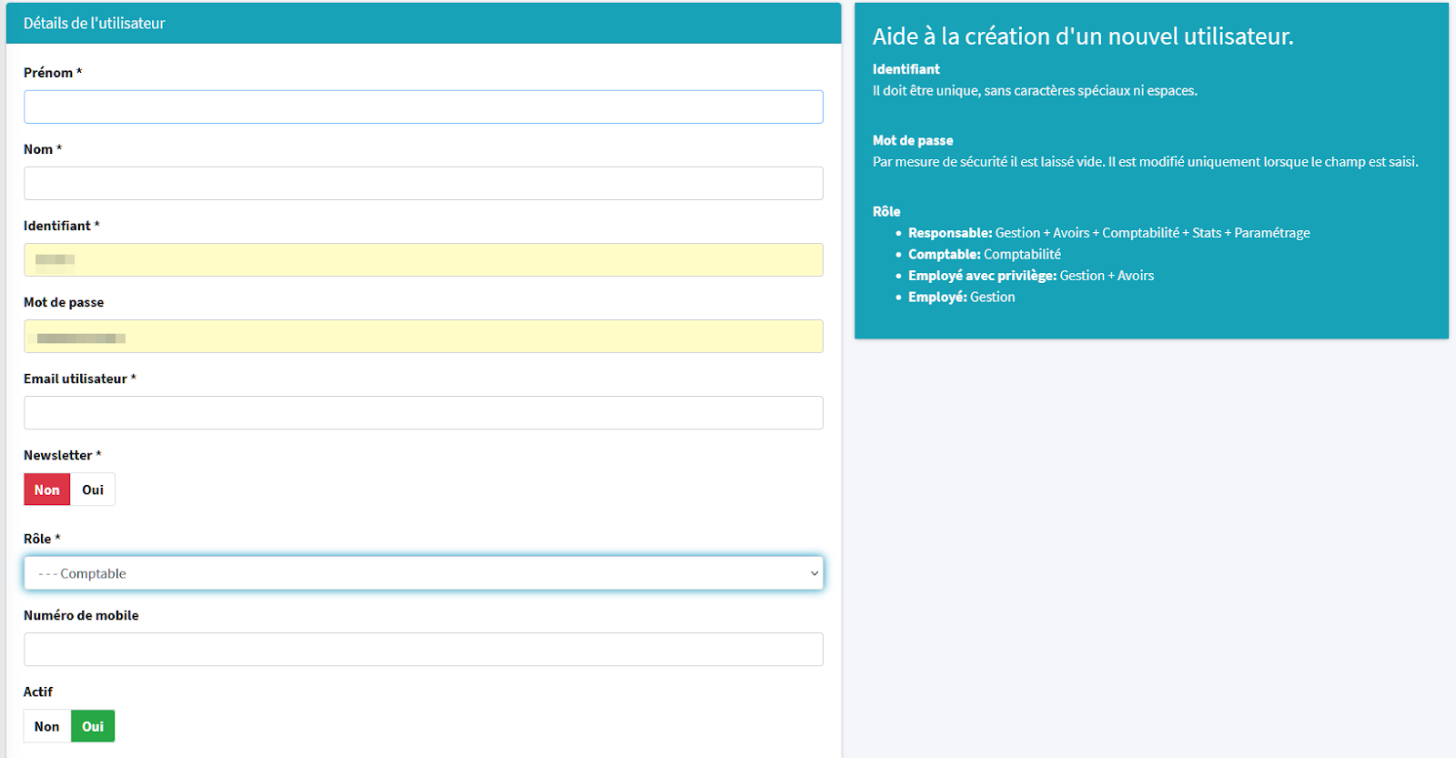 Rôle : Définit le niveau de droits dans le logiciel (plus d’informations plus bas)