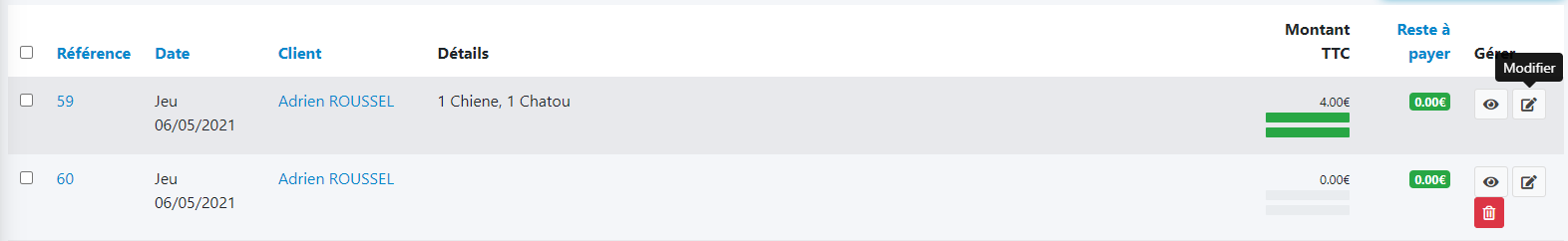 Lorsque la vente annexe est effaçable, une icône poubelle est affichée dans la colonne « Gérer ». Pour information, une vente annexe n’est effaçable que si elle n’est associée à aucune Facture