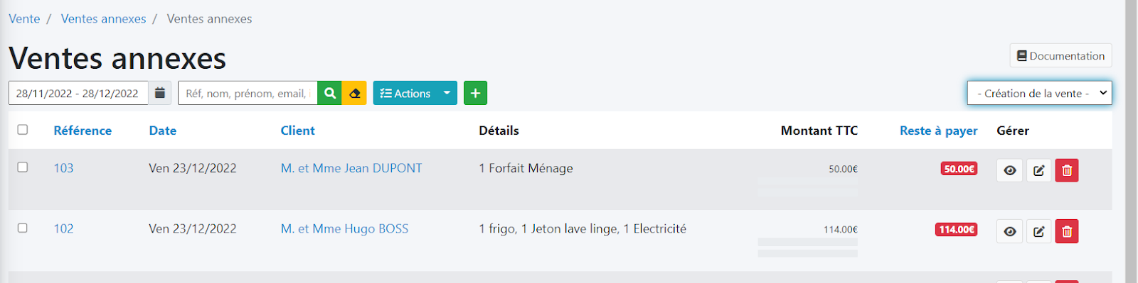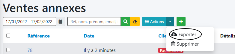 Référence : la référence cliquable de la vente annexe. Un clic sur la référence vous amène en mode visualisation de la vente annexe.