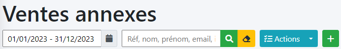 Vous retrouvez facilement une vente annexe grâce au champ de recherche multicritères affiché sur la première ligne. Vous entrez une référence vente annexe, une bribe de nom, prénom ou d’adresse email et lancez la recherche en cliquant sur le bouton « Rechercher ».